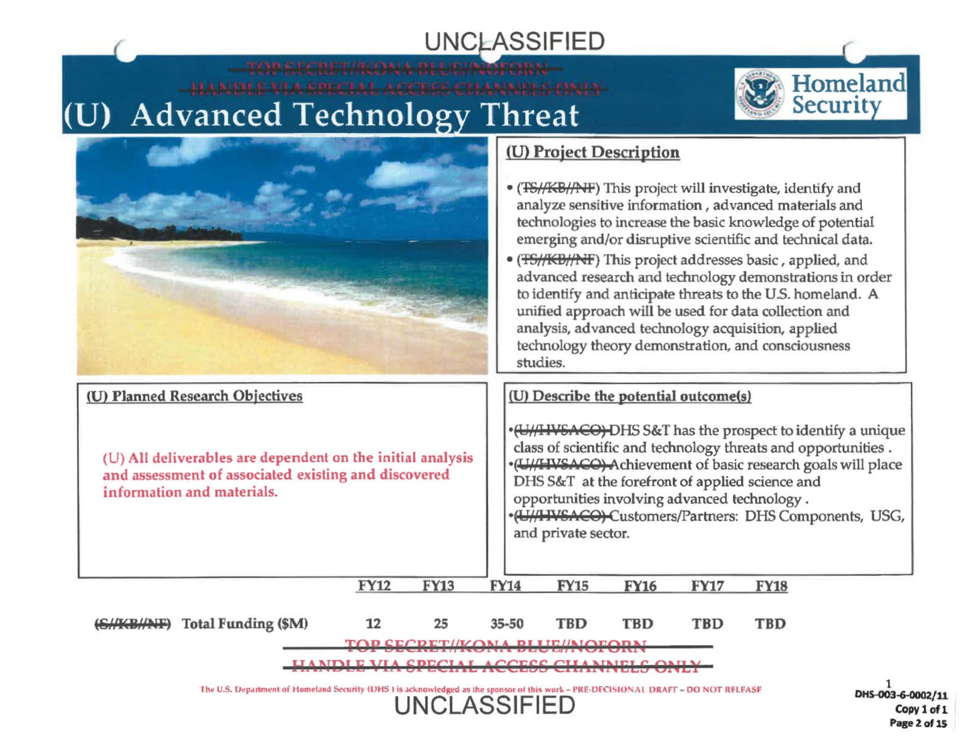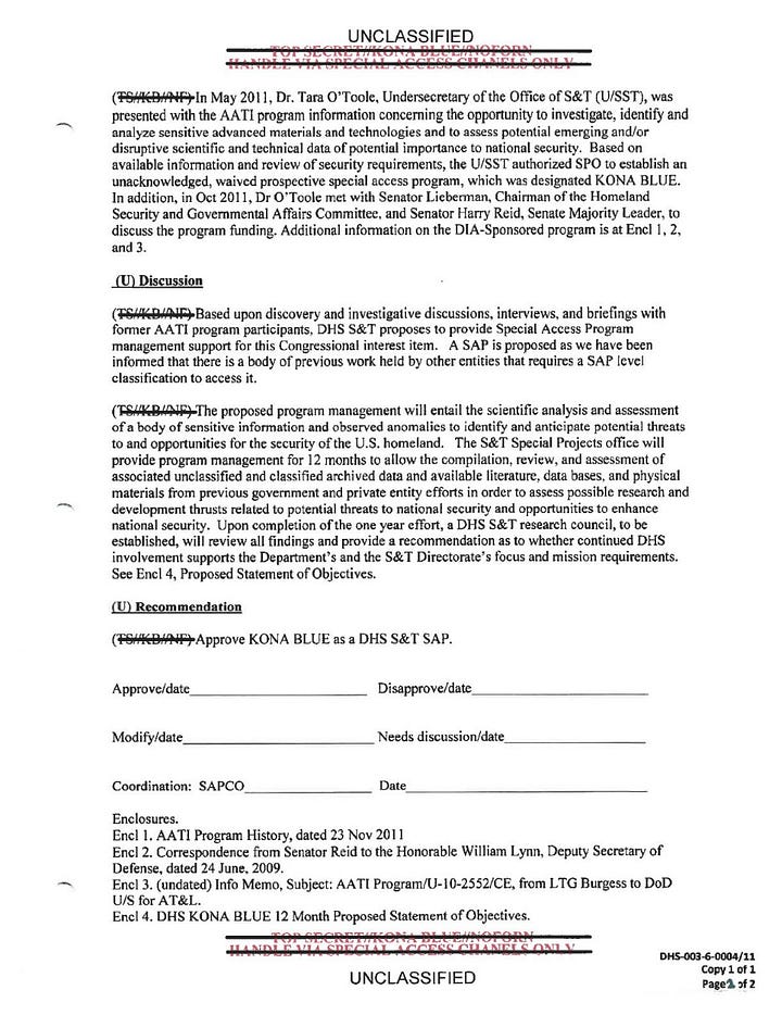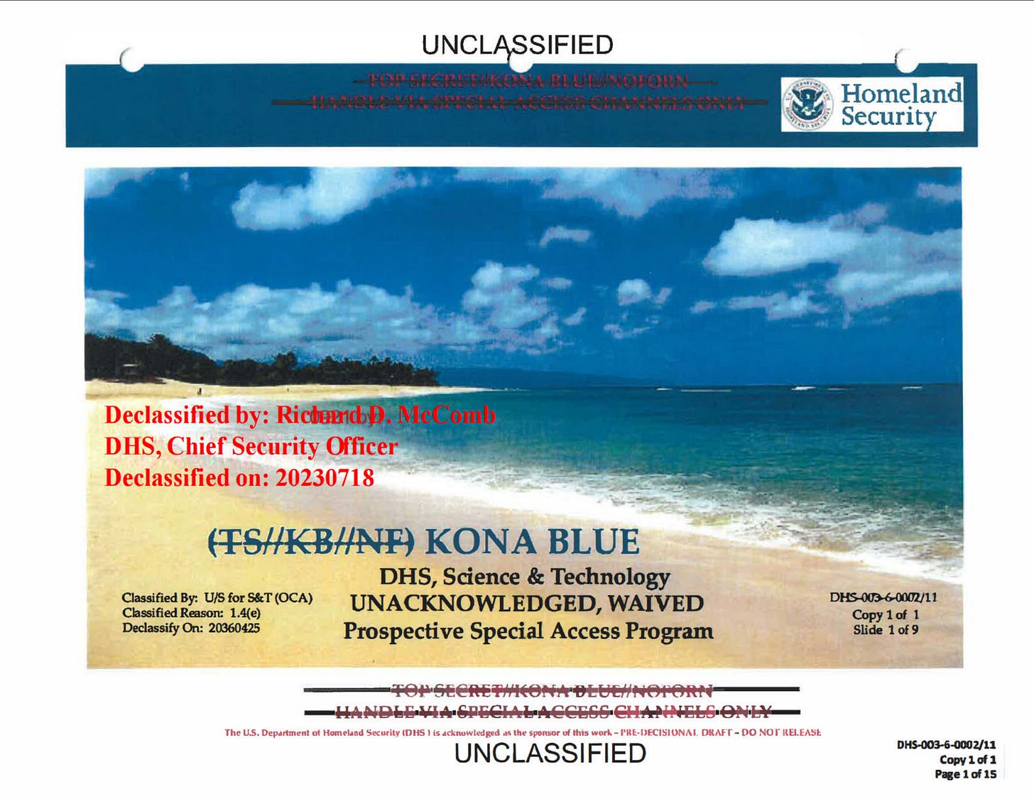 KONA BLUE was the code name of the proposed continuation of AAWSAP. Below are the first two pages of the declassified pdf of KONA BLUE, a prospective special access program that, if created, would have been part of the Department of Homeland Security’s Science and Technology division. The full 56-page pdf is available through AARO’s website.